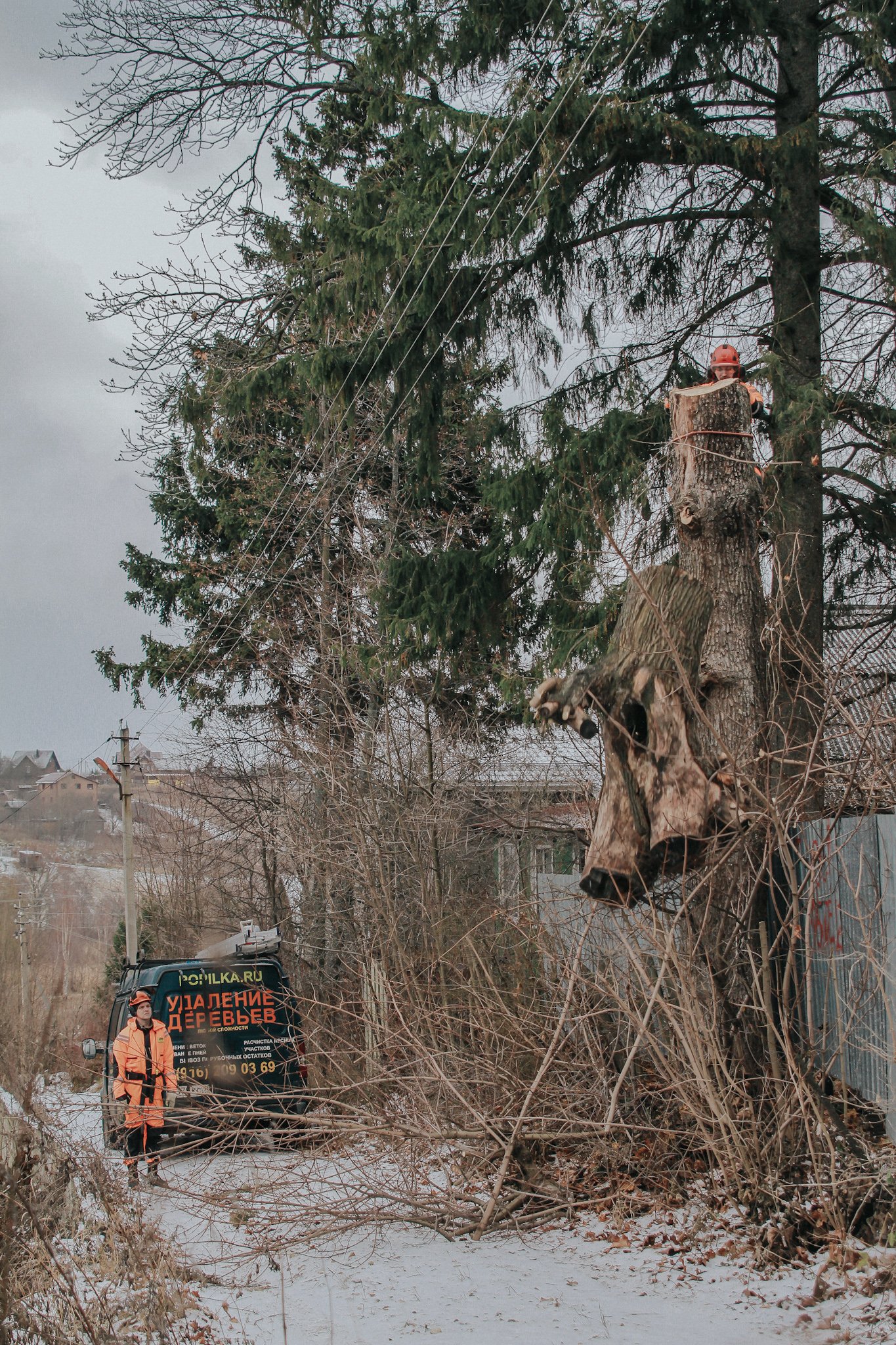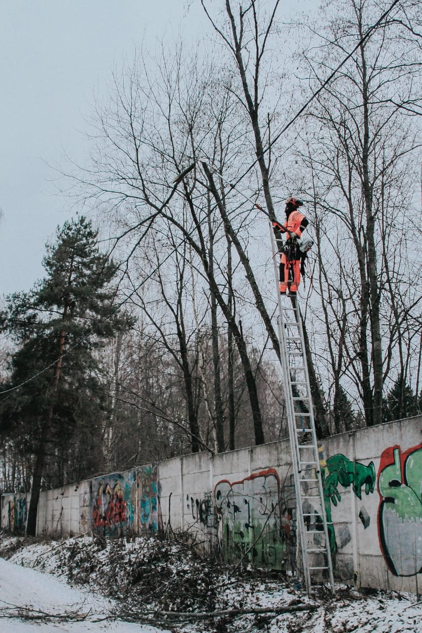 К нам часто обращаются из администраций СНТ с просьбой обрезать ветки деревьев в зоне прохождения ЛЭП. При небольших объемах работы выполняются альпинистким методом, а когда нужно выполнить большой объем работ мы привлекаем автовышку. В даном случае приглашать вышку не было необходимости.