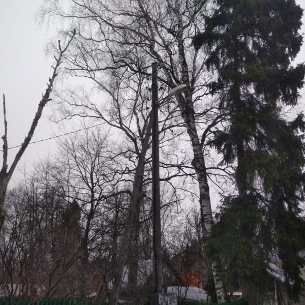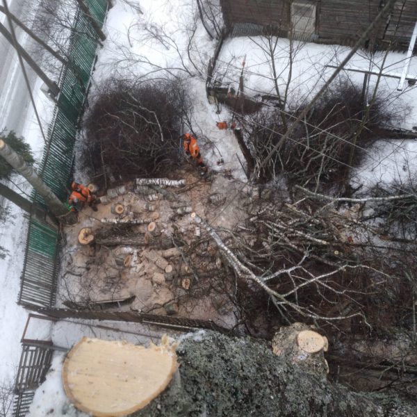 Удаление трех старых берез среди проводов и заборов. Аккуратно разборали деревья по частям с контролируемым спуском фрагментов. Ветки сложили в кучу, а стволы распилили на дрова. Несмотря на погодные условия работы произвели за один день.