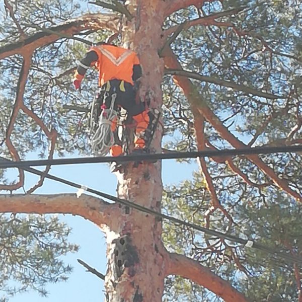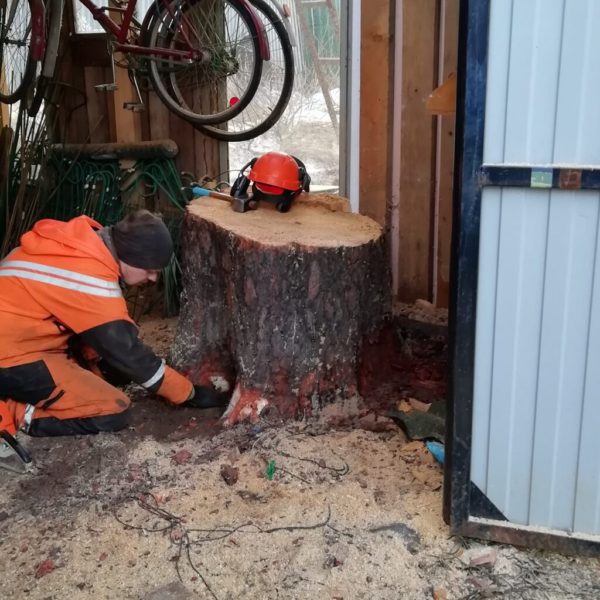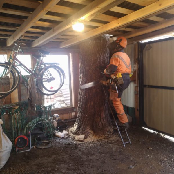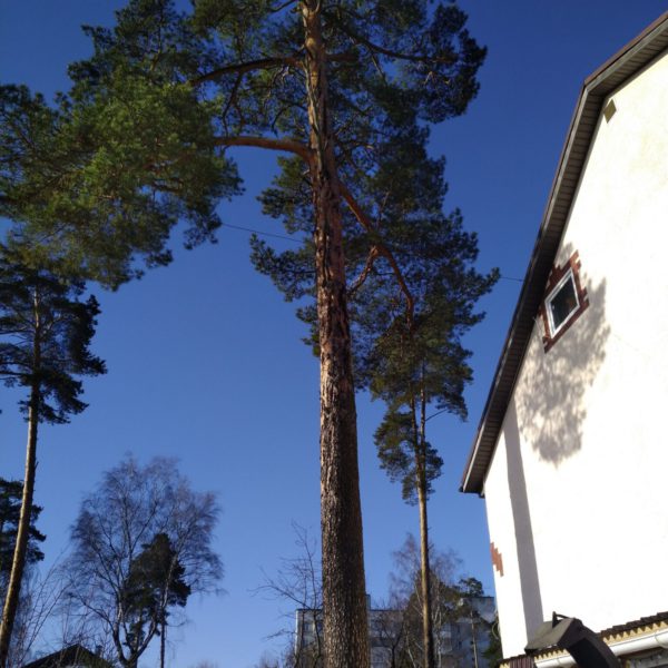 Когда приходится спиливать такие большие деревья, невольно испытываешь чувство сожеления. Больше века дерево стояло и наверняка было свидетелем многих исторических событий, происходивших в городе Пушкино, недалеко от железнодорожного вокзала. Хозяева долго не хотели расставаться с этой вековой сосной и при строительстве гаража оставили ее, сделав проем в крыше. Но со временем, глядя на огромные ветви, нависающие над небольшим двором, приняли решение все-таки спилить ее. В связи с тем что места для складирования веток было не так много, сразу после опускания на землю их перерабатывали в щепу измельчителем веток. Ствол пришлось пилить на фрагменты длиной около одного метра, но даже такие небольшие куски кантовать и оттягивать было непросто. Когда дошли до высоты ствола около 5 метров, начали нарезать ствол «блинами» по 25-30 см и сбрасывать вниз на «подушку» из последних спиленных веток. На земле все части были распилены на дрова. Для того чтобы пень не занимал место в гараже, его убрали ниже уровня земли на 20 см пнедробильной машиной.